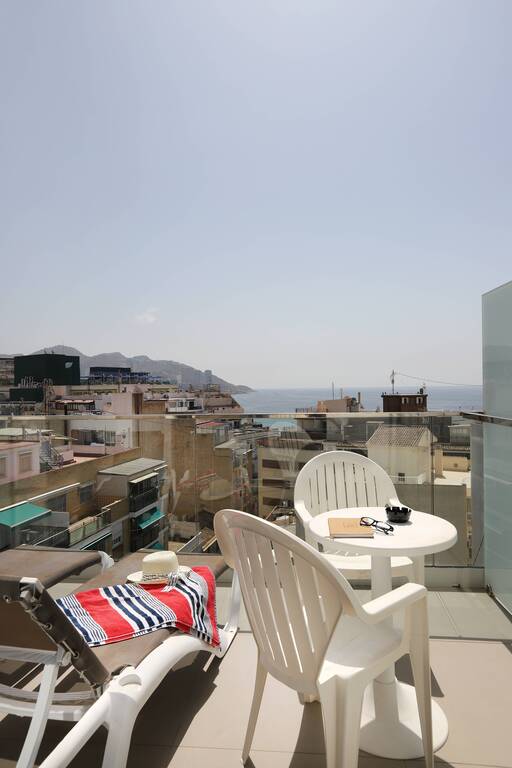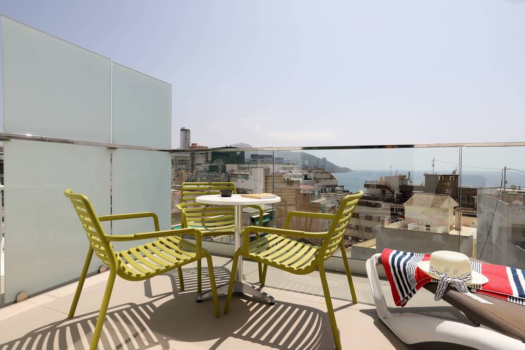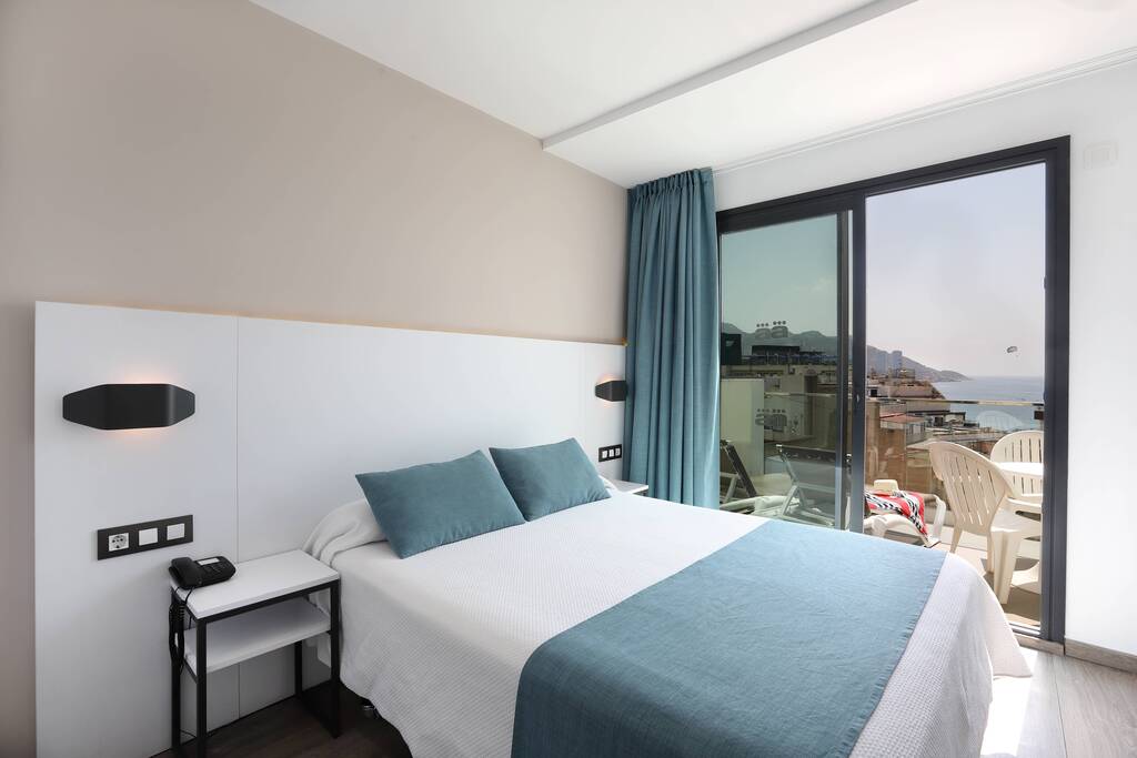 Nuestra habitación Superior con Vistas al Mar en el Hotel Alameda en Benidorm, luminosa y con una relajante decoración en blanco y gris cálido, ofrece un amplio espacio de 22m2, distribuido entre el dormitorio con 2 camas individuales y una baño con una potente ducha. Todas las habitaciones tienen vistas al mar con hamacas en la terraza y vistas a la calle Alameda, la atractiva vía peatonal en la que se encuentra nuestro hotel. Cama de matrimonio o 2 camas individuales, sujeto a disponibilidad. Cuna, gratis, previa petición
